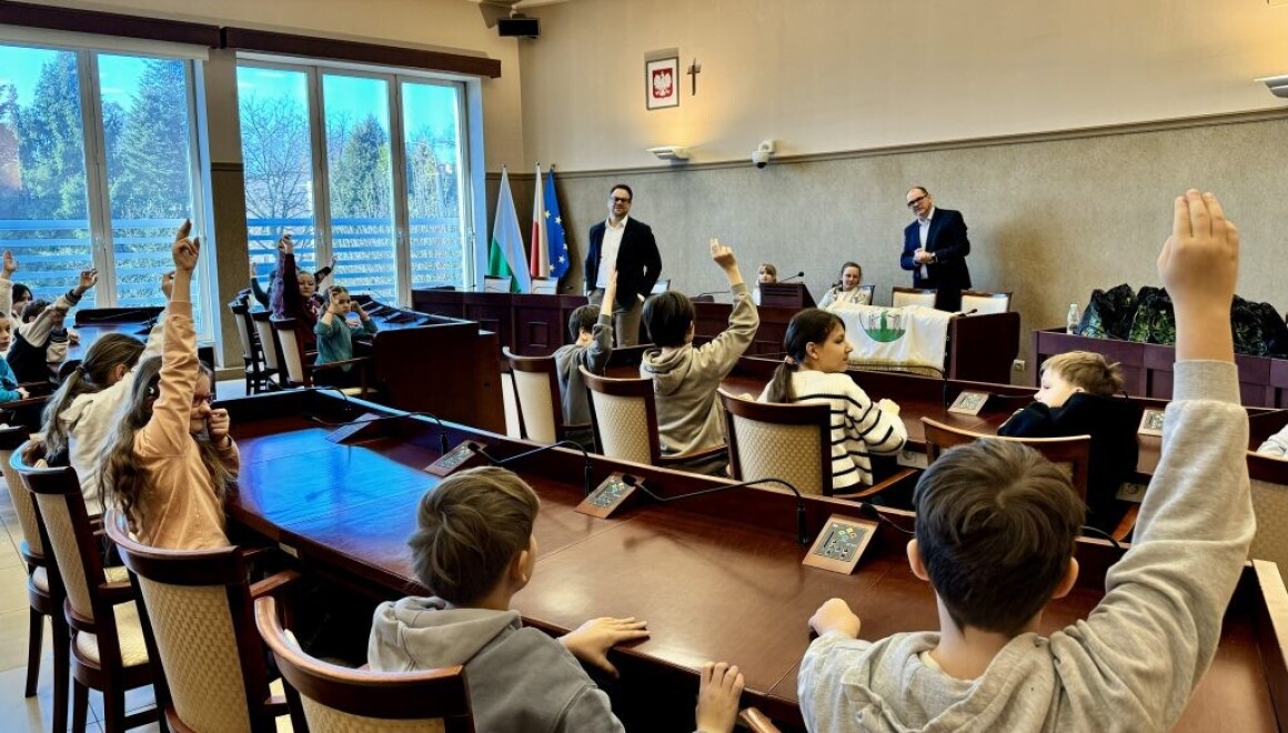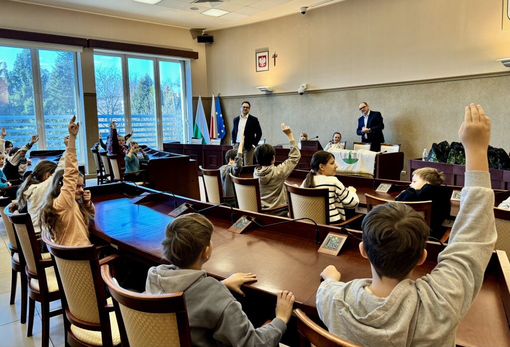 Podczas wizyty dzieci mogły także na chwilę wcielić się w role samorządowców. Zasiadając przy stole obrad, spróbowały swoich sił jako prezydent i radni, prowadząc fragment sesji Rady Miejskiej. Dzięki temu mogły zobaczyć, jak w praktyce wygląda podejmowanie decyzji i dyskusja nad miejskimi sprawami.