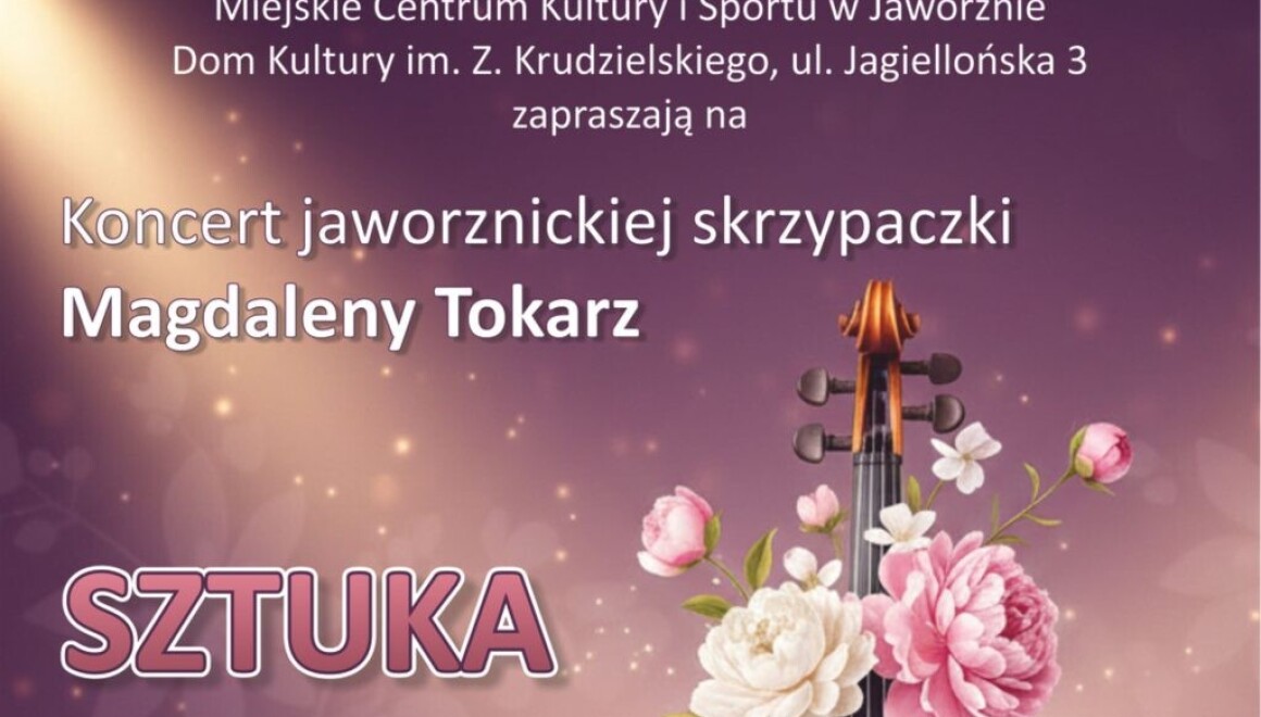 Miejskie Centrum Kultury i Sportu w Jaworznie zaprasza 14 marca 2026 r. o godz. 17:00 do Domu Kultury im. Zdzisława Krudzielskiego w Szczakowej przy ul. Jagiellońska 3 na wyjątkowe wydarzenie muzyczne – recital jaworznickiej skrzypaczki, Magdaleny Tokarz. W programie koncertu, zatytułowanego „Sztuka jest kobietą”, usłyszeć będzie można zarówno klasyczne kompozycje, jak i utwory współczesne, w tym własne aranżacje artystki.
