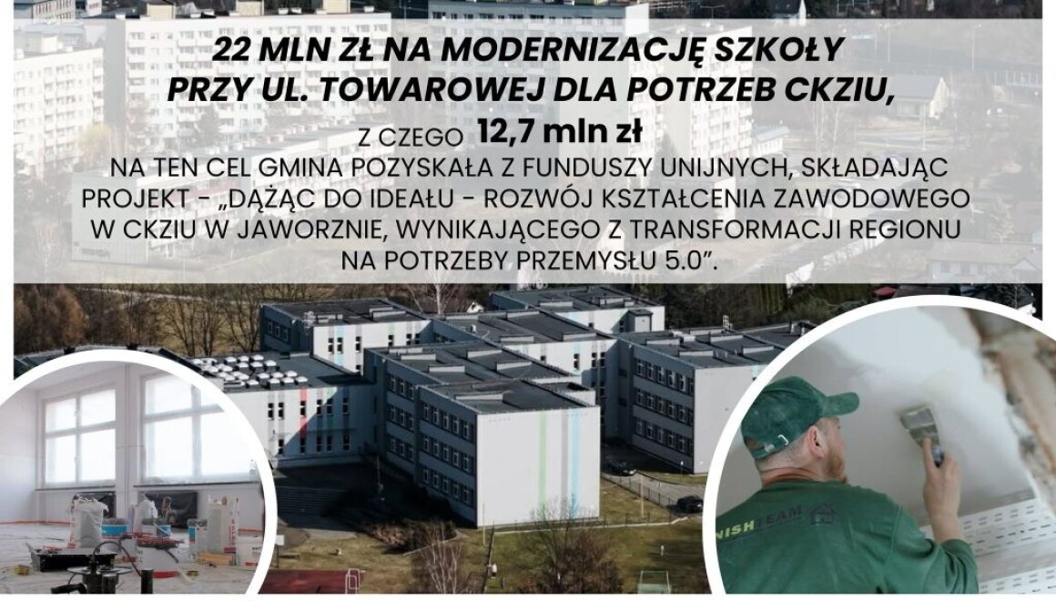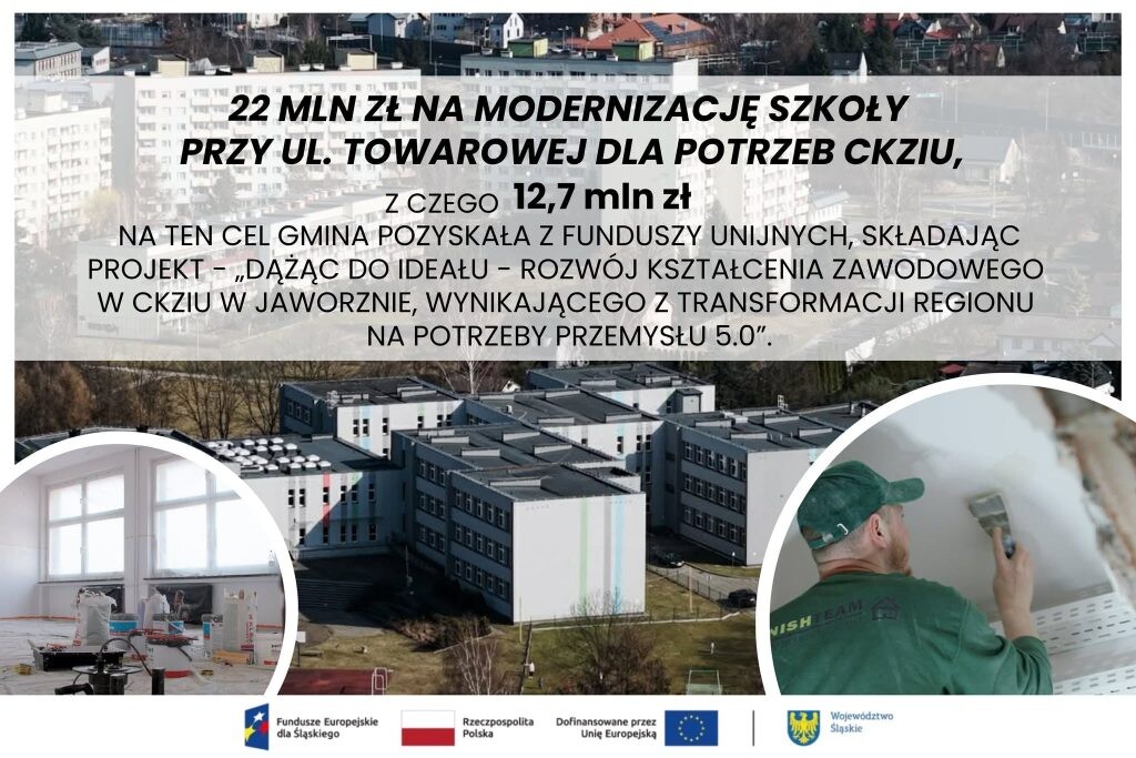 22 mln złotych wyniesie modernizacja budynku szkolnego na ul. Towarowej 61, który modernizowany jest na potrzeby Centrum Kształcenia Zawodowego i Ustawicznego w Jaworznie. 12,7 mln zł na ten cel Gmina pozyskała z funduszy unijnych, składając projekt – „Dążąc do ideału – rozwój kształcenia zawodowego w CKZiU w Jaworznie, wynikającego z transformacji regionu na potrzeby Przemysłu 5.0”.