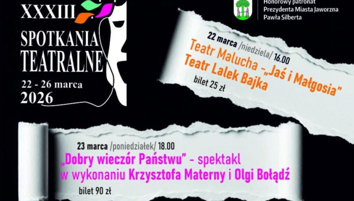 Pod honorowym patronatem Prezydenta Miasta Jaworzna Pawła Silberta, od 22 do 26 marca 2026 r. odbędzie się XXXIII edycja Spotkań Teatralnych. Przed mieszkańcami pięć dni pełnych emocji, wzruszeń i artystycznych spotkań z teatrem, muzyką oraz sztuką. Wszystkie wydarzenia odbędą się w sali teatralnej ATElier Kultury przy ul. A. Mickiewicza 2 w Jaworznie. Program został przygotowany z myślą o różnych grupach odbiorców – od najmłodszych widzów po dorosłą publiczność.