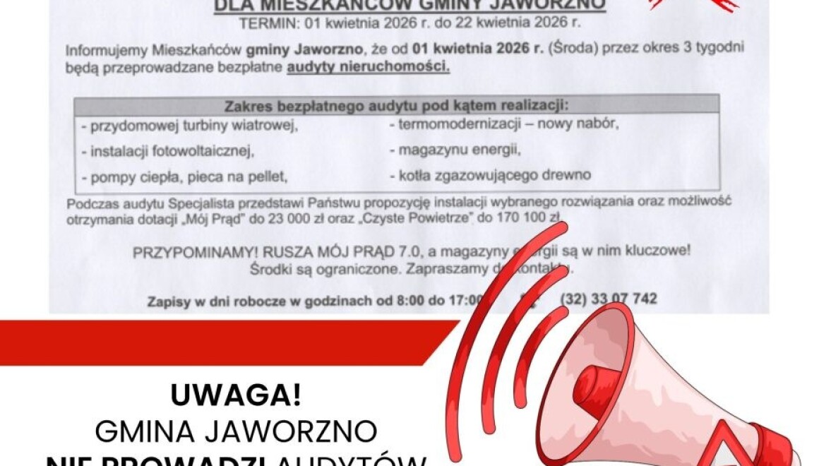 Podkreślamy, że niniejsza informacja ma wyłącznie charakter wyjaśniający i informacyjny. Jej celem jest wskazanie, że Gmina Jaworzno nie ma związku z prowadzonymi audytami. Wpis nie stanowi oceny legalności działań podmiotów oferujących tego typu usługi.