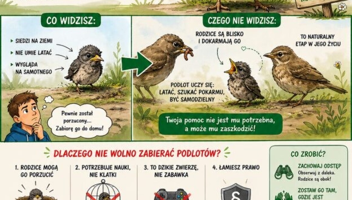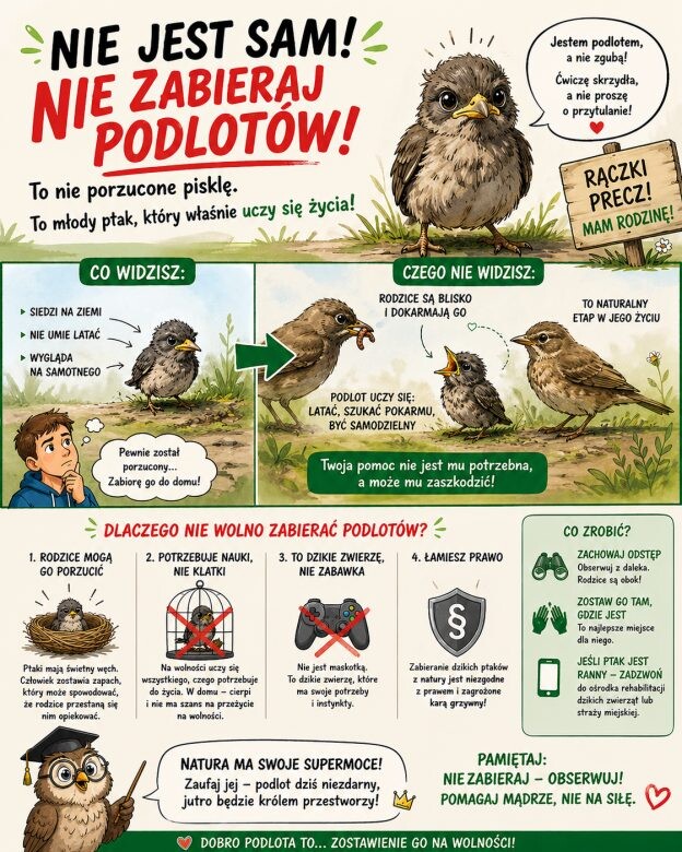 Pamiętaj: Najlepszą szkołą przetrwania dla ptaka jest natura, a najlepszymi nauczycielami – jego rodzice. Jeśli widzisz podlota, który wygląda zdrowo: po prostu odejdź.