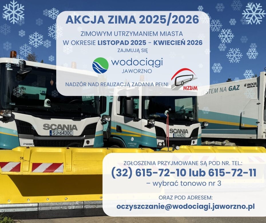 Miejskie służby już zakończyły przeglądy techniczne pojazdów i sprzętu, które w najbliższych miesiącach będą wykorzystywane do utrzymania przejezdności dróg i chodników. Wodociągi Jaworzno, którym od 2021 roku powierzono realizację zadania zimowego utrzymania dróg, przeprowadziły kompleksowe przygotowania do Akcji Zima 2026. Tegoroczna akcja potrwa od listopada 2025 roku do kwietnia 2026 roku.