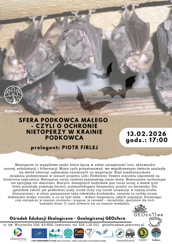 Ośrodek Edukacji Ekologiczno-Geologicznej GEOsfera w Jaworznie zaprasza w piątek, 13 lutego 2026 r., o godz. 17:00 na spotkanie pt. „Sfera podkowca małego – o ochronie nietoperzy w Krainie Podkowca”, realizowane w ramach cyklu GEOcoffee.