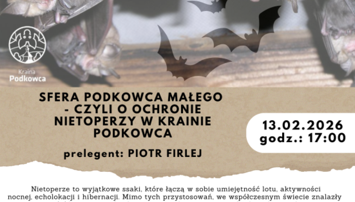 Podczas spotkania poruszone zostaną zagadnienia związane z ochroną podkowca małego oraz innych gatunków nietoperzy występujących w naszym regionie. Wykład przybliży wpływ zmian środowiskowych na życie nietoperzy oraz działania podejmowane w ramach projektu LIFE+ Podkowiec Towers, którego celem jest tworzenie bezpiecznych miejsc schronienia i rozrodu dla tych zwierząt w silnie przekształconym przez człowieka krajobrazie.