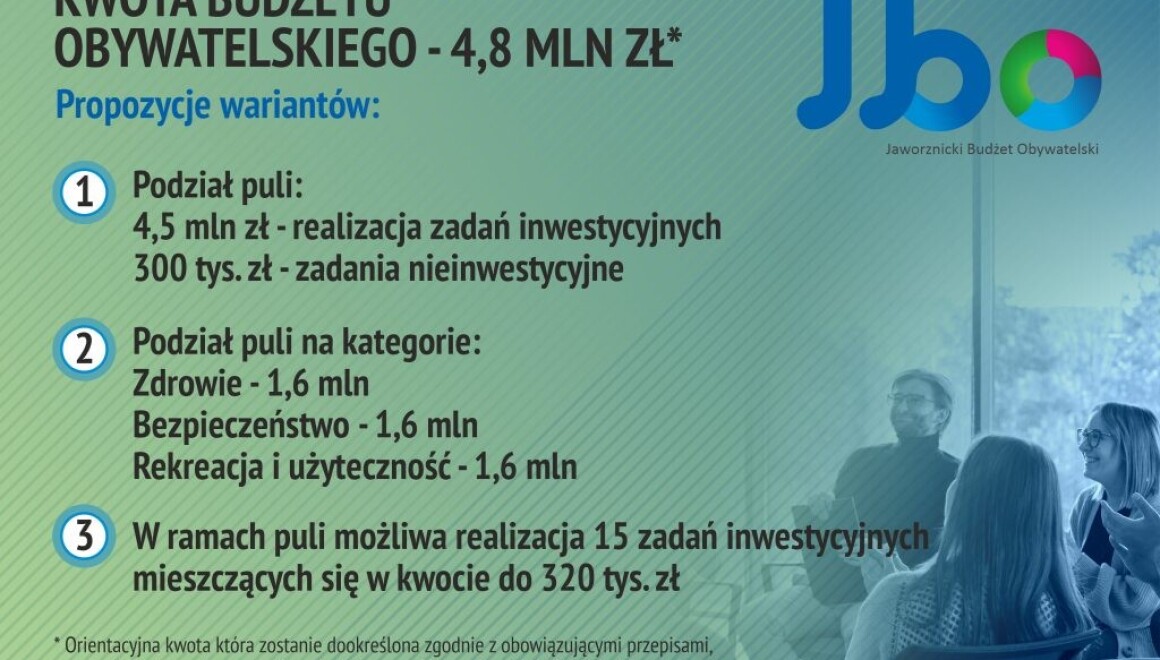Za nami półmetek prac nad procedurą Jaworznickiego Budżetu Obywatelskiego. W nowej edycji JBO planowana pula środków wynosi 4,8 mln zł*. W ramach przygotowań przedstawiono trzy propozycje wariantów dotyczących podziału budżetu. Teraz, do 2 marca br., czekamy na uwagi i spostrzeżenia do zaprezentowanych propozycji.