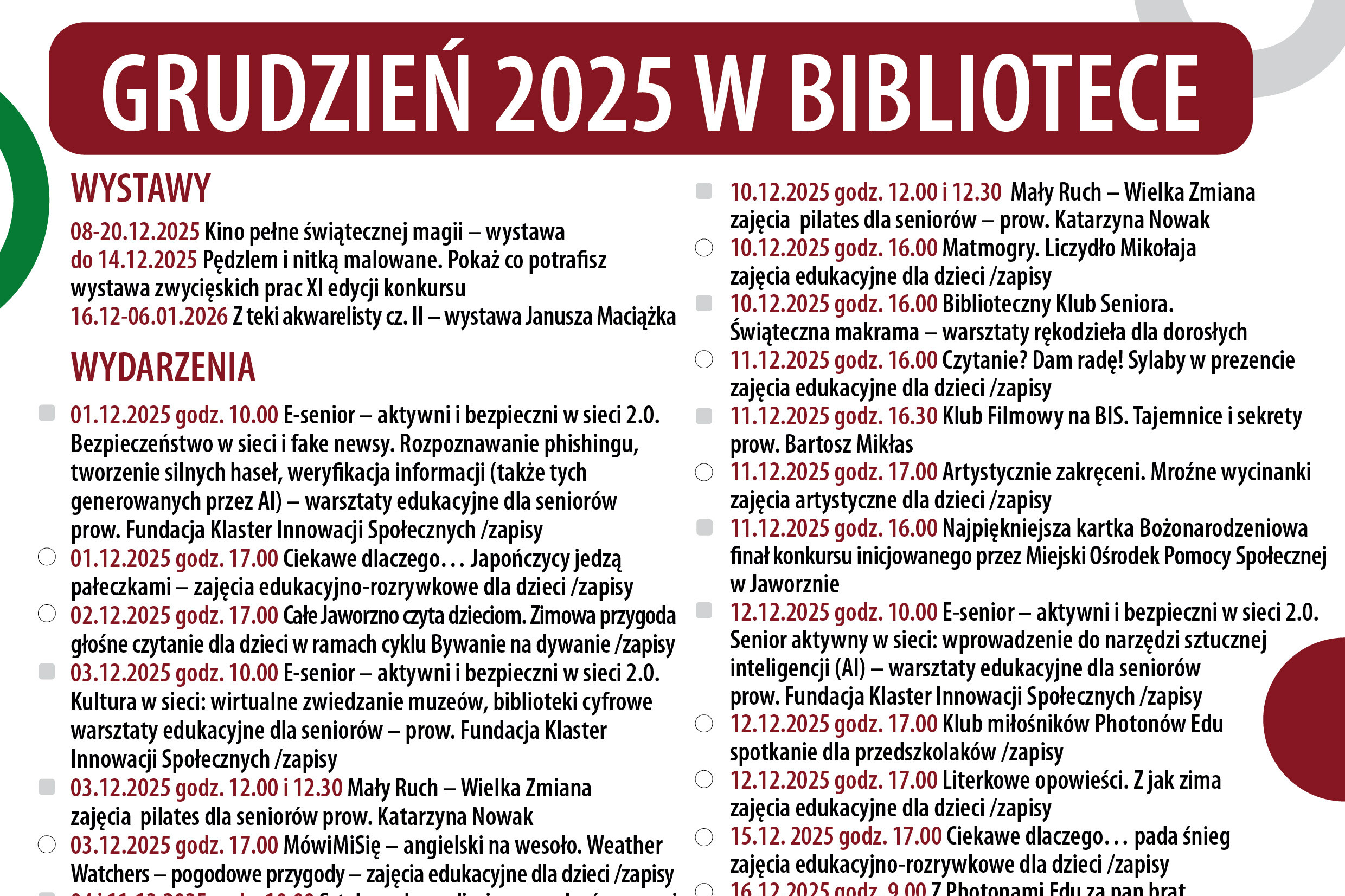 Mieszkańcy miasta, korzystający z naszych usług, mogą z powodzeniem rozwijać zainteresowania, twórczo spędzać wolny czas, zdobywać wiedzę oraz uczestniczyć w wydarzeniach kulturalnych i rozrywkowych, wśród których szczególnie polecamy: wystawy, pokazy filmowe, warsztaty plastyczne i komputerowe, dyskusyjne kluby książki, filmowe, spotkania z autorami, konkursy literackie, małe formy artystyczne - recitale, koncerty, spektakle.