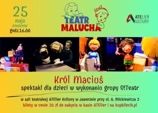 Już 25 maja 2025 r. o godz. 16.00 zapraszamy do ATElier Kultury w Jaworznie, ul. A. Mickiewicza 2, na spektakl "Król Maciuś" w wykonaniu grupy O!Teatr: