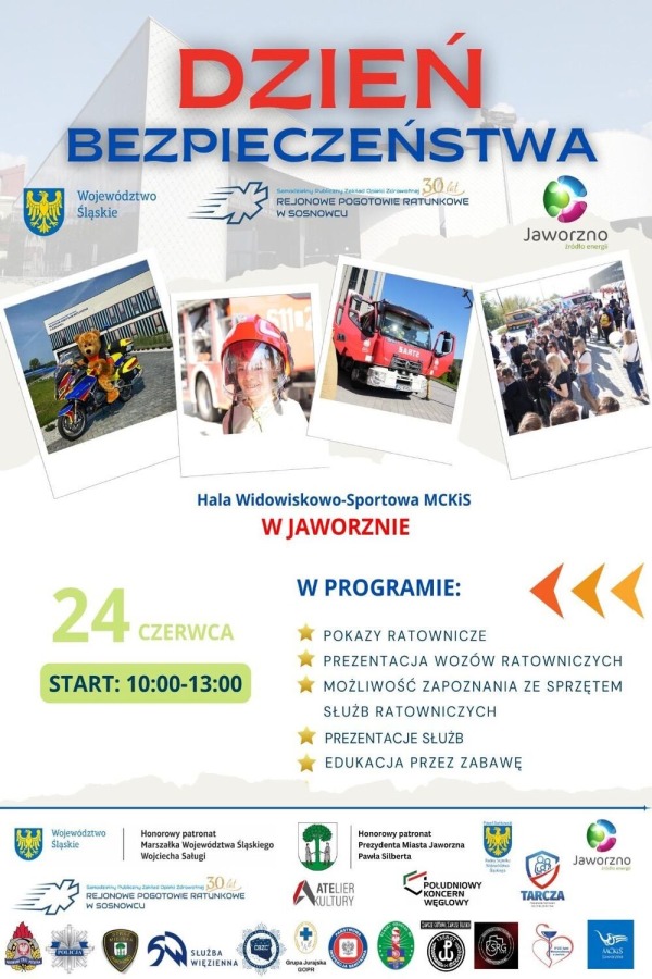 24 czerwca 2025 r. w Hali Widowiskowo-Sportowej MCKiS w Jaworznie (ul. Grunwaldzka 80) odbędzie się Dzień Bezpieczeństwa – wydarzenie, podczas którego uczestnicy będą mogli zapoznać się z zasadami udzielania pierwszej pomocy, zobaczyć specjalistyczne pokazy ratownicze oraz poznać pracę służb ratunkowych od kulis.
