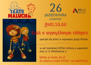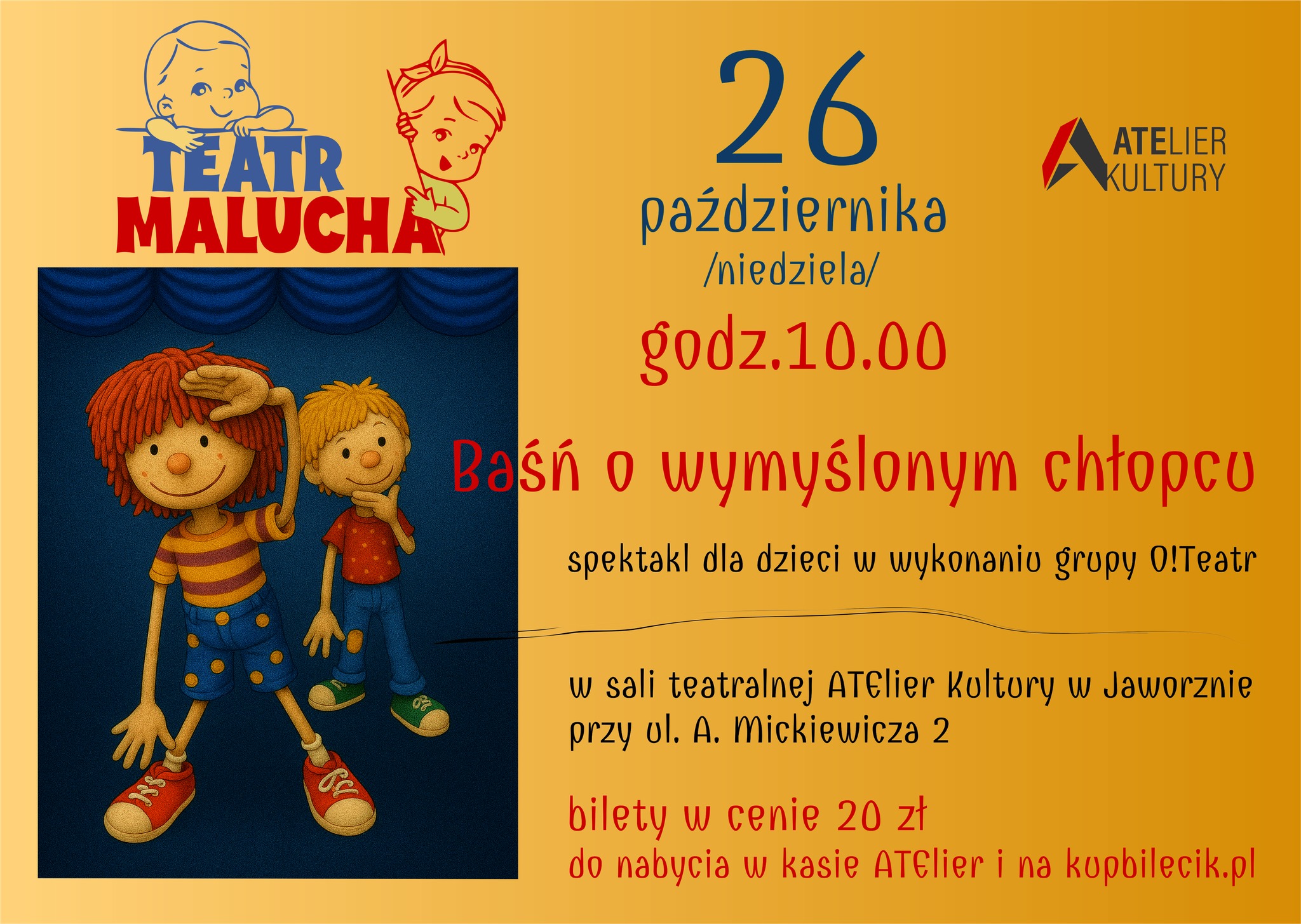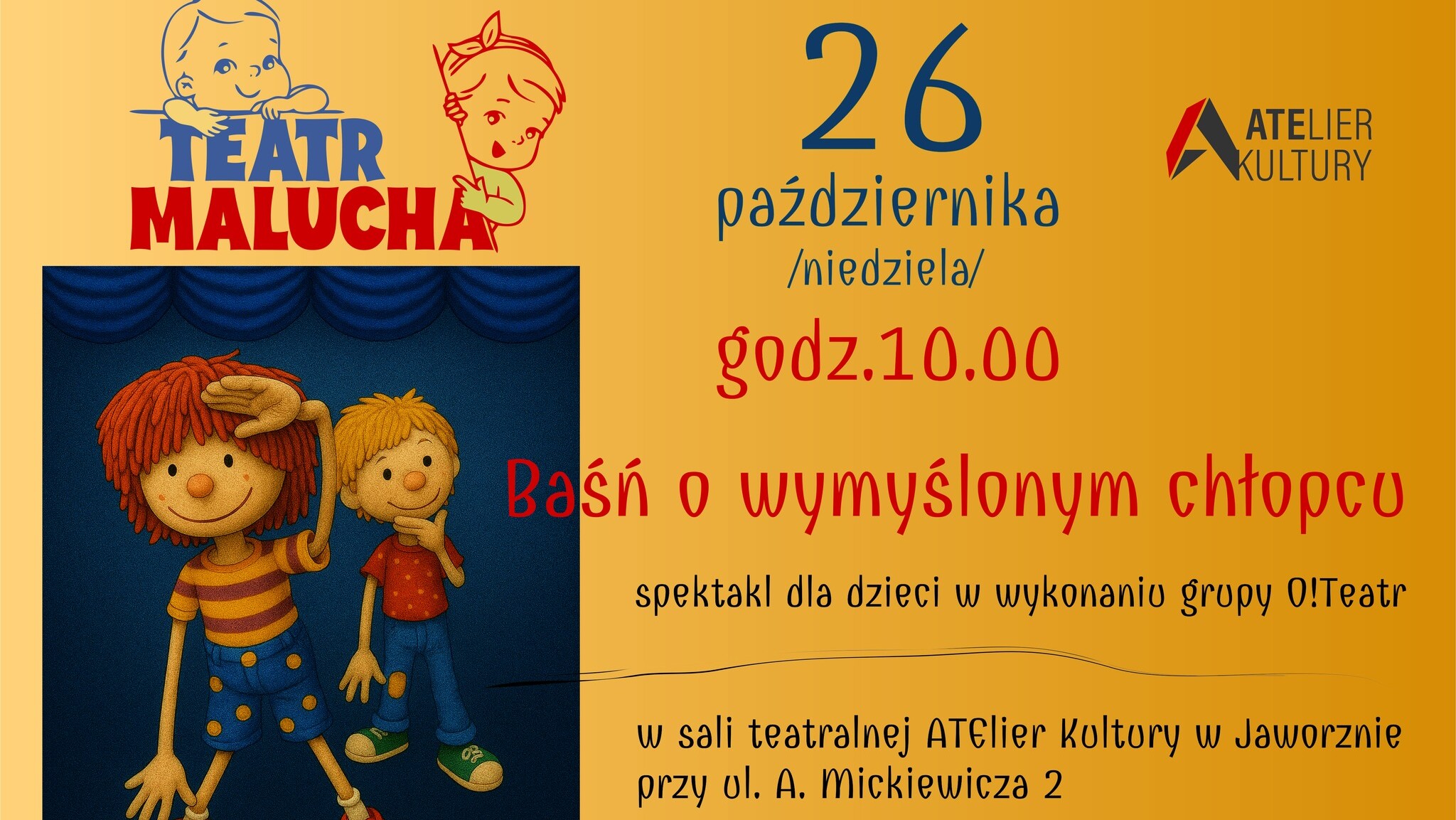 Już 26 października 2025 r. wyjątkowo o godz. 10.00 zapraszamy do ATElier Kultury w Jaworznie, ul. A. Mickiewicza 2, na "Baśń o wymyślonym chłopcu" w wykonaniu grupy O!Teatr. Baśń to sympatyczna komediowa opowieść o poszukiwaniu własnego „ja” w nieco fantastycznym świecie. Opowieść o wyborach i ich konsekwencjach, o sile i wpływie zła, o kształtowaniu własnego charakteru. Spektakl zbudowany na klasycznych elementach baśni odnoszący się jednak do współczesnego świata. Spektakl lalkowy z lalkami wielkości dorosłego człowieka. Jest to historia z happy endem. Historia o tym, jak bohaterka usamodzielnia się, poznaje smak wolności i przyjaźni, dokonuje własnych wyborów; z biernej drobinki staje się postacią aktywną, opiekuńczą, uczynną, wrażliwą na dostrzegane cierpienie.