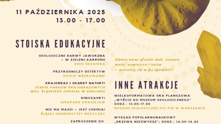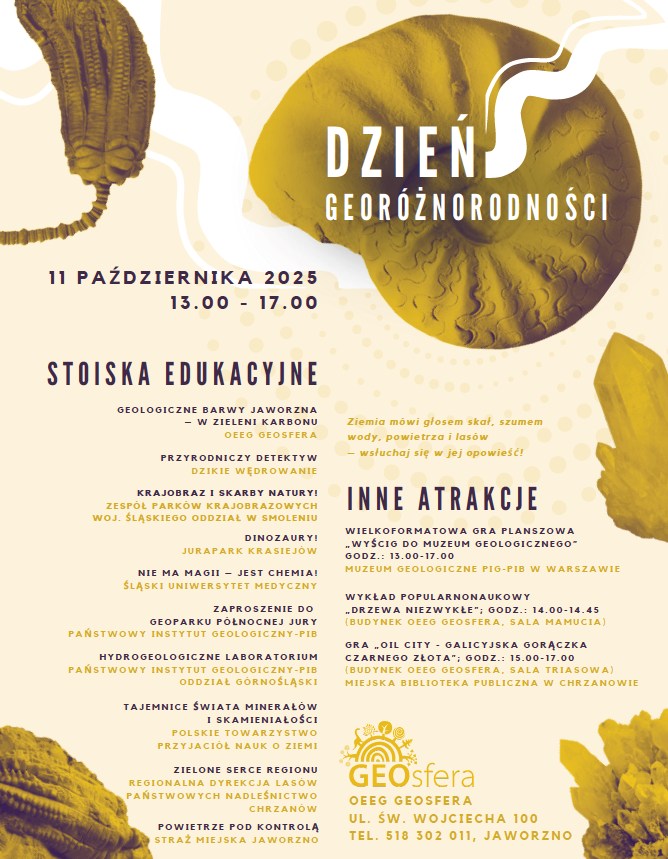 zapraszamy do GEOsfery na plenerową imprezę edukacyjną, która pozwoli odkryć bogactwo Ziemi – od tajemnic karbońskich lasów, skamieniałości i minerałów, po dinozaury, hydrogeologię, sekrety powietrza, krajobrazu oraz lasów.