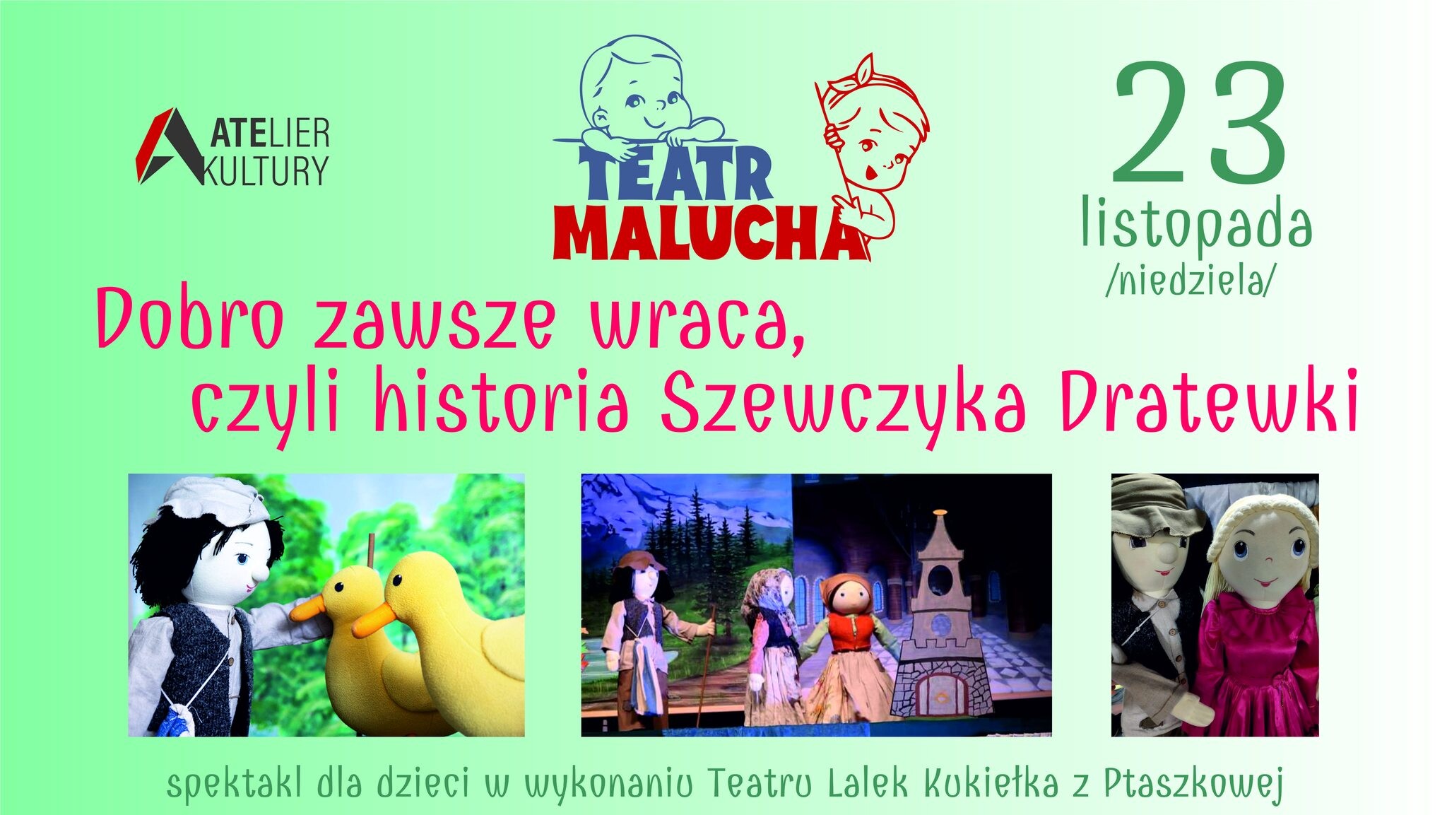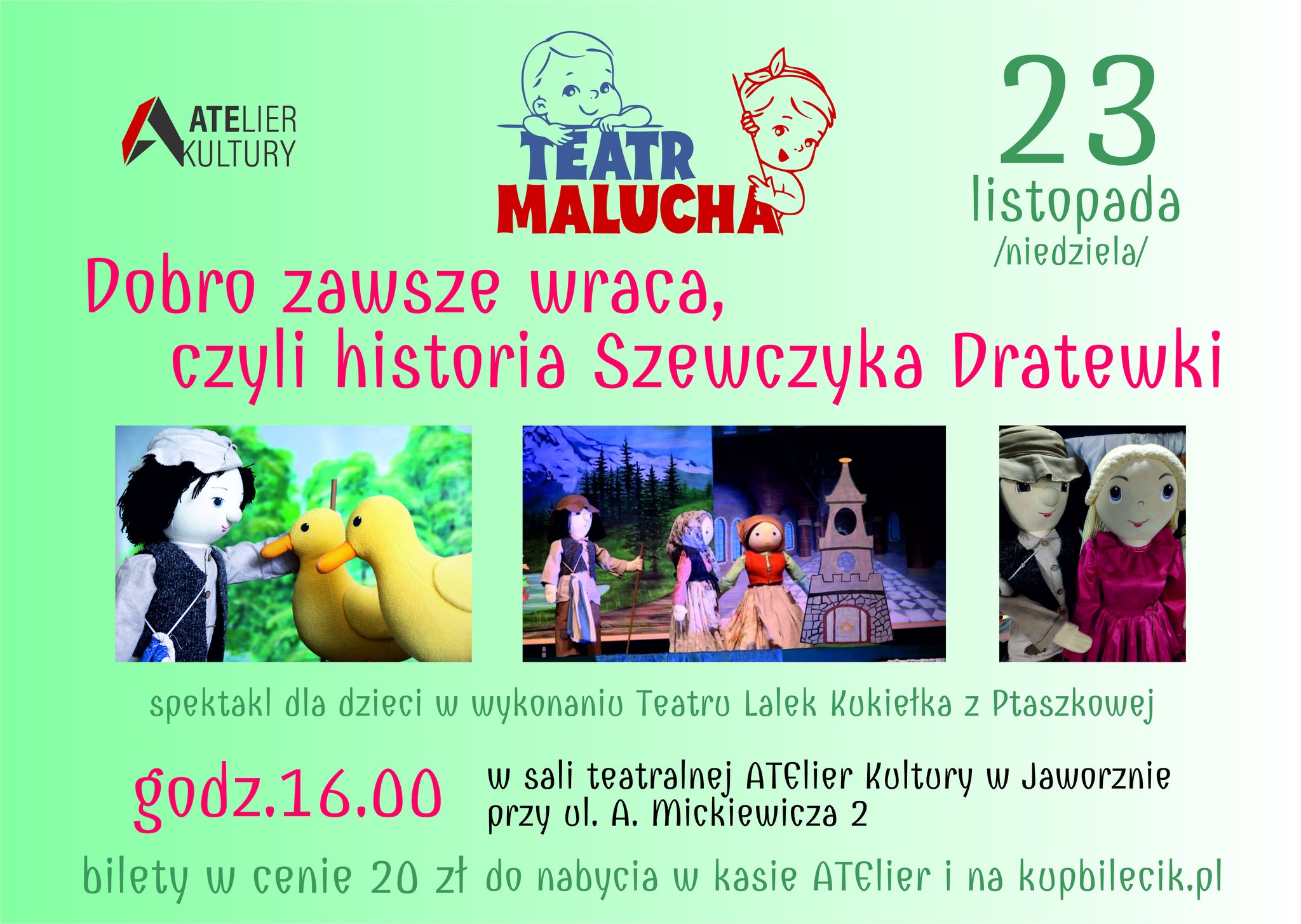 Już 23 listopada 2025 r. o godz. 16.00 zapraszamy do ATElier Kultury w Jaworznie, ul. A. Mickiewicza 2, na spektakl "Dobro zawsze wraca, czyli historia Szewczyka Dratewki" w wykonaniu Teatru Lalek Kukiełka z Ptaszkowej.
