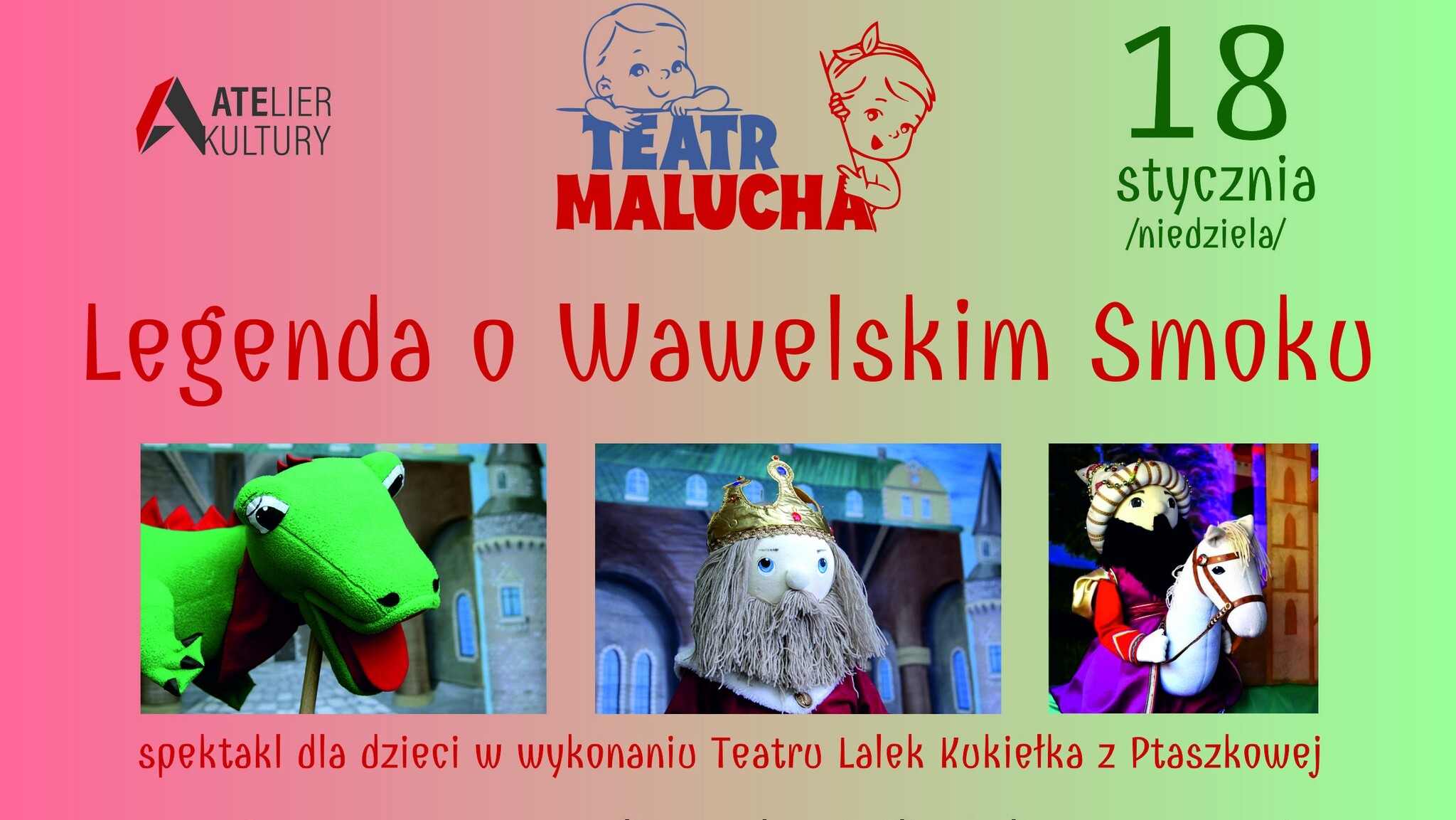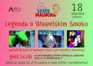 Już 18 stycznia 2026 r. o godz. 16.00 zapraszamy do ATElier Kultury w Jaworznie, ul. A. Mickiewicza 2, na spektakl "Legenda o Wawelskim Smoku" w wykonaniu Teatru Lalek Kukiełka z Ptaszkowej.