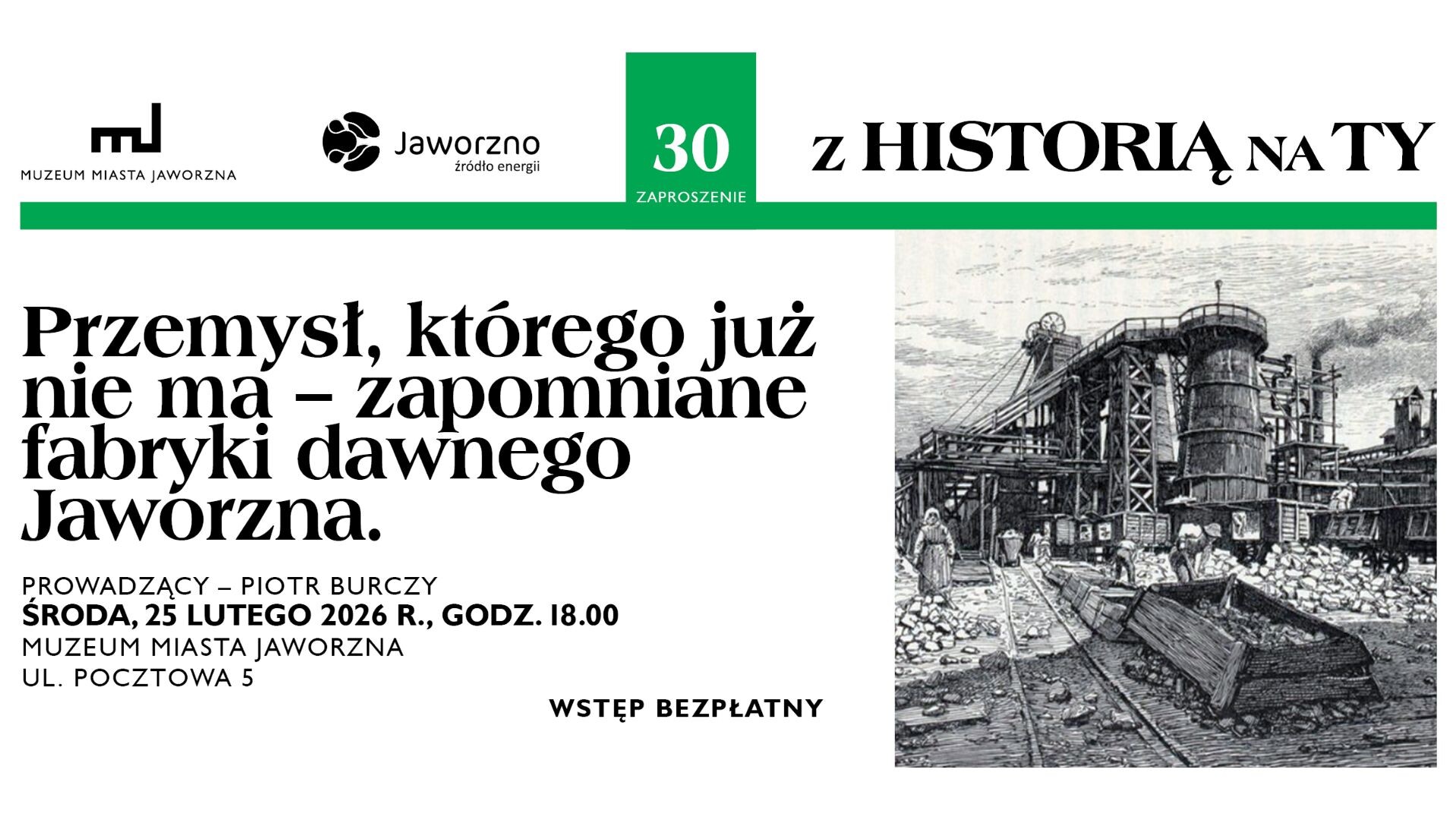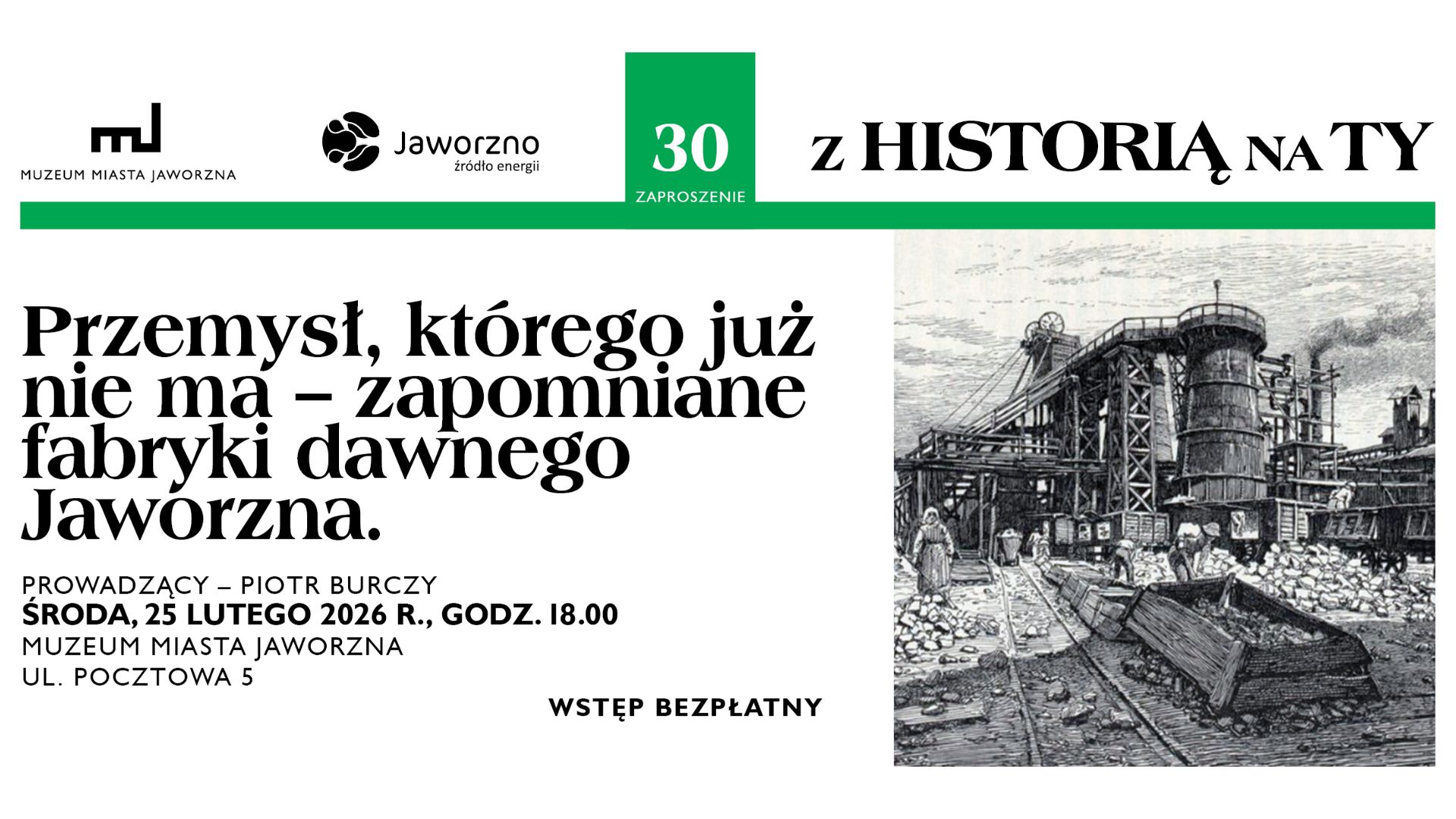 30. wykład z serii „Z Historią na Ty” pt. „Przemysł, którego już nie ma - zapomniane fabryki dawnego Jaworzna” odbędzie się w środę – 25 lutego – o godz. 18:00 w siedzibie naszego Muzeum, przy ul. Pocztowej 5.