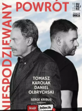 Gąszcz różnych wątków, które splatają się w wyśmienity komediodramat - to właśnie "Niespodziewany powrót". Spektakl w gwiazdorskiej obsadzie - na scenie Daniel Olbrychski i Tomasz Karolak - to doskonała rozrywka teatralna dla wymagającej widowni. W ,,Niespodziewanym powrocie" Daniel Olbrychski wciela się w postać aktora, który ma zagrać króla Leara. Szczególna trema i wielkie nadzieje związane z podjęciem tak dużego aktorskiego wyzwania nie są Olbrychskiemu obce. W końcu sam mierzył się z nimi, kiedy grał główne role w spektaklach Szekspira. Tłem dla aktorskich rozterek są skomplikowane relacje rodzinne - kłopoty z partnerami, rodzicami i dziećmi, które niezwykle bawią, jeśli tylko nas nie dotyczą! Ważną postacią jest zwłaszcza syn głównego bohatera - w tej roli doskonale znany publiczności z wielu produkcji telewizyjnych i kinowych Tomasz Karolak. Aktor o dużym talencie komediowym z wejściem w postać też nie będzie miał problemu - w końcu synem jest od urodzenia! Dokąd zabrną te wszystkie wątki? Jak będzie się układać relacja ojca z synem? Jest tylko jeden sposób, by przekonać się o tym wszystkim - trzeba się wybrać do teatru! Autor: Serge Kribus Przekład: Bożena Puchalska Obsada: Daniel Olbrychski, Tomasz Karolak