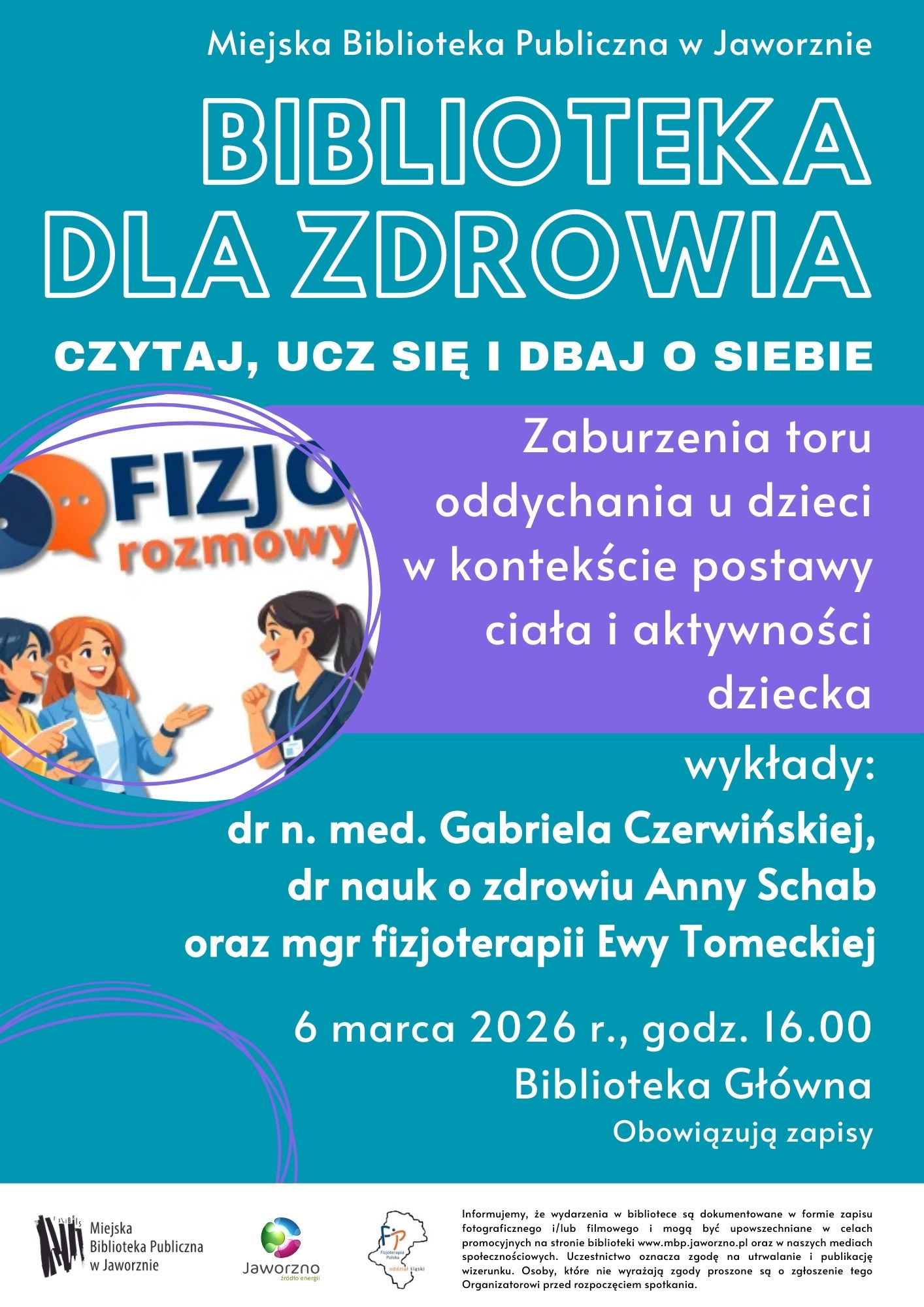 W ramach realizacji cyklu pn. Biblioteka dla zdrowia, 6 marca br. w godz. 16.00-19.00, w jaworznickiej Bibliotece Głównej odbędzie się spotkanie edukacyjne pt. Zaburzenia toru oddychania u dzieci – podejście fizjoterapeutyczne, którego celem jest propagowanie nowoczesnej wiedzy w powyższym zakresie oraz kształtowanie prawidłowych nawyków zdrowotnych. W roli prelegentów wystąpią: dr n. med. Gabriela Czerwińska – specjalistka otolaryngologii, dr nauk o zdrowiu Anna Schab – fizjoterapeutka, mgr fizjoterapii Ewa Tomecka – fizjoterapeutka. Inicjatorami przedsięwzięcia są: Stowarzyszenie Fizjoterapii Polskiej – Oddział Śląski oraz Ośrodek Rehabilitacyjno-Wychowawczego dla Dzieci Niepełnosprawnych w Jaworznie.