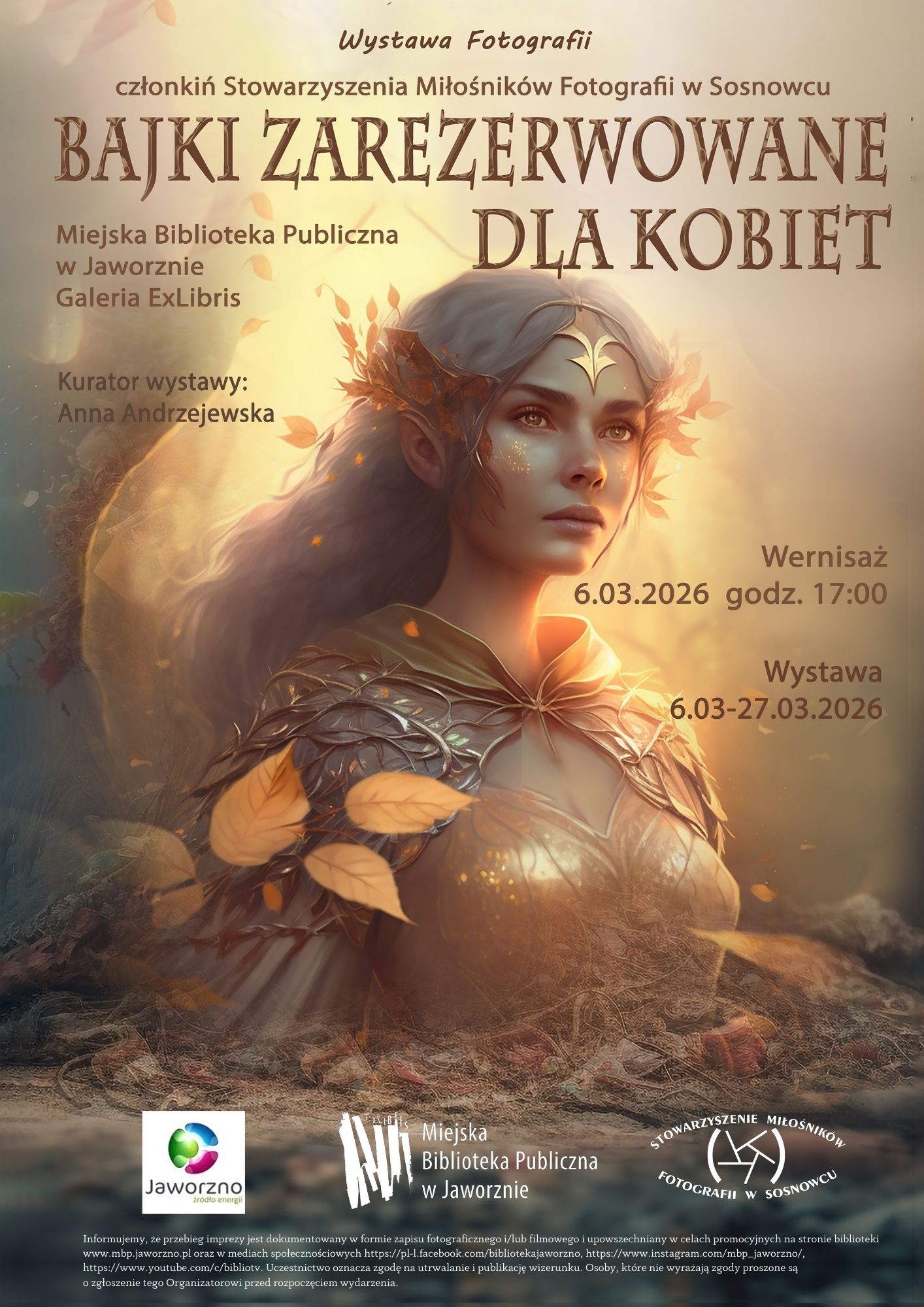 Miejska Biblioteka Publiczna w Jaworznie serdecznie zaprasza do Galerii ExLibris, w której od 6 marca br. prezentować będziemy wystawę zdjęć pt. Bajki zarezerwowane dla kobiet. Ekspozycja, składająca się z 17 prac, to efekt twórczej działalności artystek ze Stowarzyszenia Miłośników Fotografii w Sosnowcu. Każda z nich opowiada inną historię – na swój sposób, we własnym języku i poprzez indywidualnie uchwycony kadr. Część zdjęć ma w sobie nutę magii i nieoczywistości, inne zaś pozostają mocno osadzone w rzeczywistości. Trochę realu, trochę wyobraźni – i właśnie w tym miksie dzieje się najwięcej. Podczas pracy nad wystawą wyraźnie wybiły się trzy motywy. Pierwszy to natura – raz jako tło, raz jako główna bohaterka, czasem bezpieczna przystań, a czasem siła, z którą trzeba się zmierzyć. Drugi to człowiek w drodze – tej prawdziwej, przez miejsca oraz kraje, i tej bardziej w środku, kiedy coś się w nas zmienia. Podróż, spotkania, nowe kultury, ale też zaglądanie w głąb siebie. Trzeci wątek dotyka tego, jacy jesteśmy – naszej wrażliwości, pamięci, tożsamości i prób ogarnięcia, kim właściwie jesteśmy.