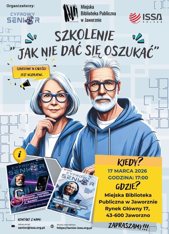 17 marca o godz. 17.00 zapraszamy seniorów na szkolenie poświęcone bezpieczeństwu w cyfrowym świecie. Spotkanie zrealizowane zostanie w ramach projektu „Cyfrowy Senior”, zainicjowanego i realizowanego przez Stowarzyszenie ISSA Polska. Celem inicjatywy jest zwiększenie świadomości zagrożeń związanych z korzystaniem z nowych technologii przez seniorów oraz przekazanie praktycznej wiedzy o sposobach skutecznego przeciwdziałania różnym formom oszustw wymierzonych w osoby starsze. Uczestnicy poznają najczęściej stosowane przez cyberprzestępców techniki socjotechniczne, a także dowiedzą się, jak właściwie reagować, aby uniknąć prób wyłudzenia wrażliwych danych lub pieniędzy.