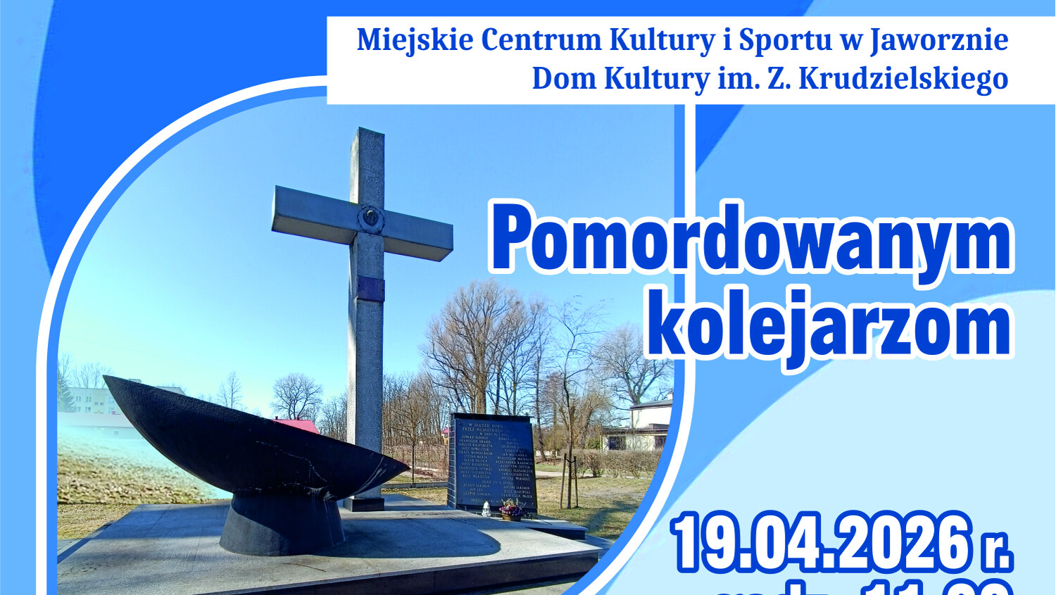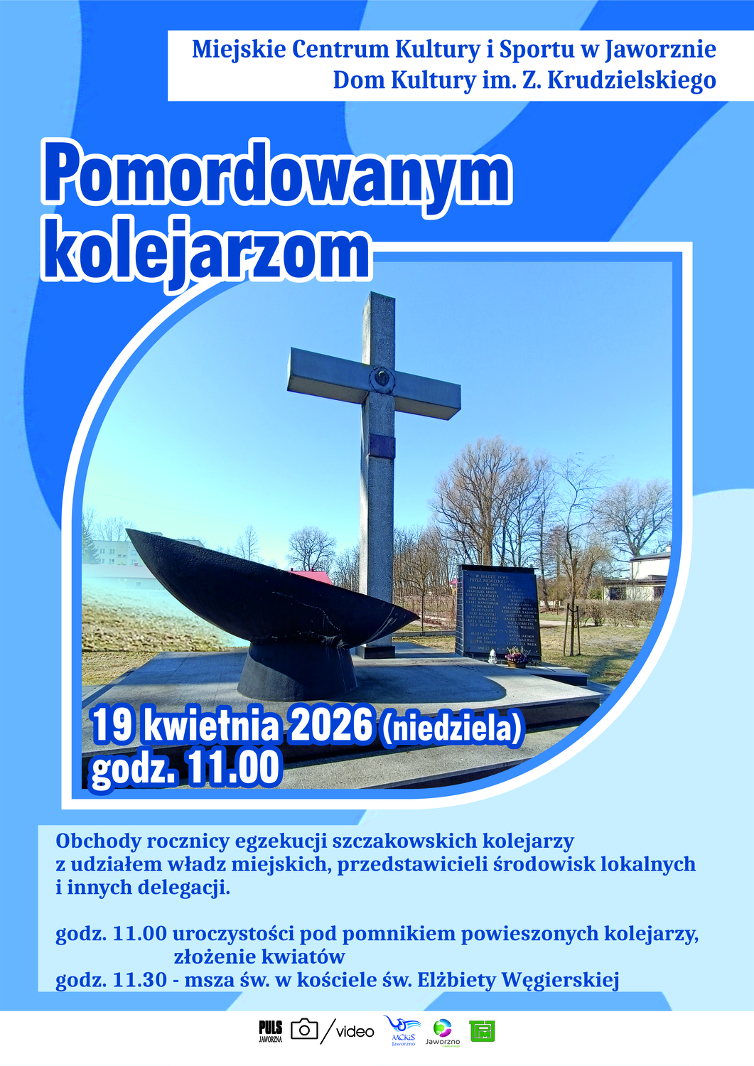 Zapraszamy mieszkańców naszego miasta, przedstawicieli władz miejskich oraz organizacji pozarządowych do wspólnego oddania hołdu pomordowanym kolejarzom, którzy zginęli z rąk okupanta. Do udziału w uroczystościach zapraszają pracownicy Miejskiego Centrum Kultury i Sportu w Jaworznie oraz członkowie Towarzystwa Przyjaciół Miasta Jaworzna.