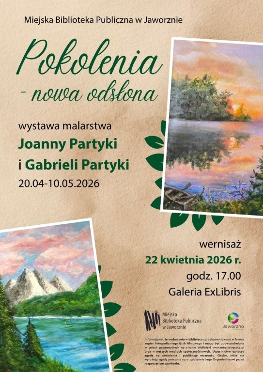 Od 20 kwietnia br. w Galerii ExLibris będzie można oglądać wystawę malarstwa pt. „Pokolenia – nowa odsłona”. To już drugie spotkanie z twórczością niezwykłego, rodzinnego duetu: Joanny Partyki oraz jej wnuczki, Gabrieli. Dwa lata po pierwszej wspólnej prezentacji, artystki powracają do naszej biblioteki, by pokazać, jak ewoluował ich warsztat oraz spojrzenie na świat. Ekspozycja dowodzi, że sztuka stanowi uniwersalny język porozumienia, zacierający granice wieku i pozwalający na budowanie głębokich, międzypokoleniowych więzi. W najnowszych pracach odnajdziemy dojrzałość i doświadczenie Pani Joanny – malarki o bogatym dorobku, wielokrotnie goszczącej w naszych progach, uhonorowanej odznaką „Zasłużony dla Kultury Polskiej”, która w swojej twórczości po mistrzowsku uwiecznia pejzaże, architekturę i motywy sakralne. Tuż obok nich pojawią się dzieła Gabrieli, obecnie uczennicy siódmej klasy, która przez ostatnie dwa lata rozwijała swoją pasję, odważnie eksperymentując z nowymi technikami i formami wyrazu.